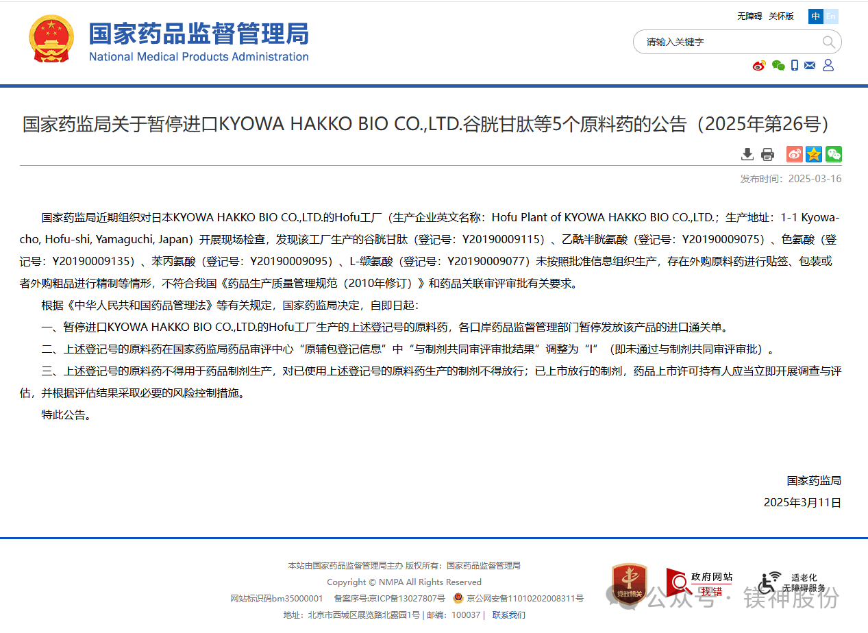 近日,國家藥監(jiān)局發(fā)布重要公告,宣布暫停進口日本KYOWA HAKKO BIO CO.,LTD.(協(xié)和發(fā)酵株式會社)生產(chǎn)的谷胱甘肽等5個原料藥。這一決定源于該公司的Hofu工廠在生產(chǎn)過程中存在未按批準信息組織生產(chǎn)、外購原料藥進行貼簽、包裝或外購粗品進行精制等嚴重違規(guī)行為,不符合我國《藥品生產(chǎn)質(zhì)量管理規(guī)范(2010年修訂)》及相關(guān)審評審批要求。為確保藥品安全與質(zhì)量,國家藥監(jiān)局已暫停上述原料藥的進口,并對其在藥品制劑中的使用進行了嚴格限制。